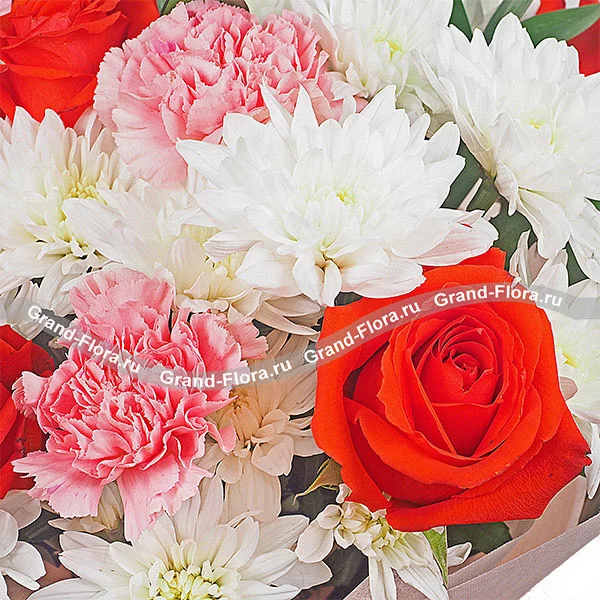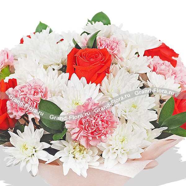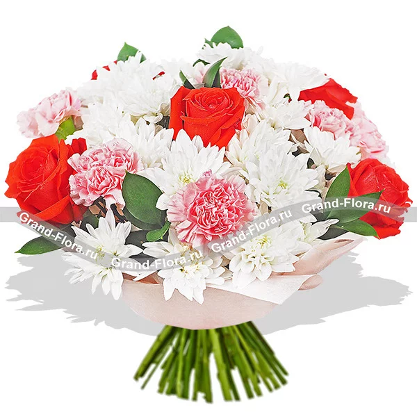 Нежнейший букет собран из утонченных кустовых белых хризантем. Выразительности композиции придают огненные красные розы и деликатные розовые гвоздики. Довершает цветочное сочетание рускус и умело подобранная упаковка. Очаровательный букет станет безупречным решением для вручения маме в день ее рождения. Кроме того, столь роскошная композиция поможет пленить сердце девушки, завоевав его навсегда.