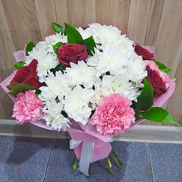 ЛЮКС: роза красная - 9 шт., гвоздика розовая - 10 шт., хризантема кустовая белая - 6 шт., рускус, фетр розовый. Примерный объем букета 35х35 см.